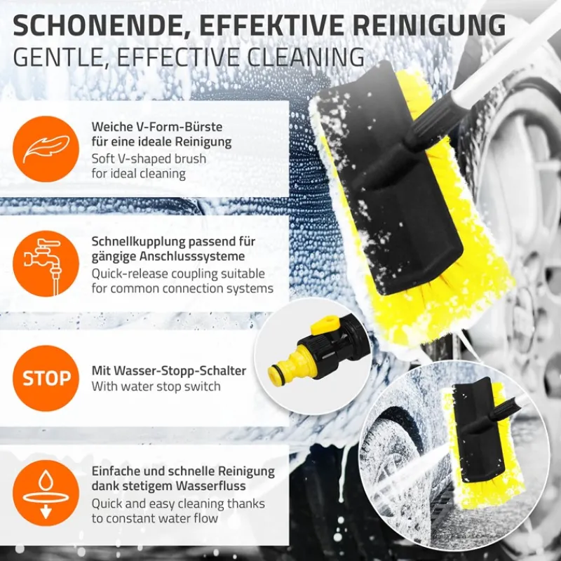 So muss eine professionelle Waschbürste aussehen. Diese Bürste mit eine Teleskopstange von 130 bis 300 cm und Wasserzufuhr ist das perfekte Werkzeug um das Auto mühelos zu säubern. Dank einem Strömungswächter und An/Aus-Schalter, können Sie auch den Wasserverbrauch komplett kontrollieren.