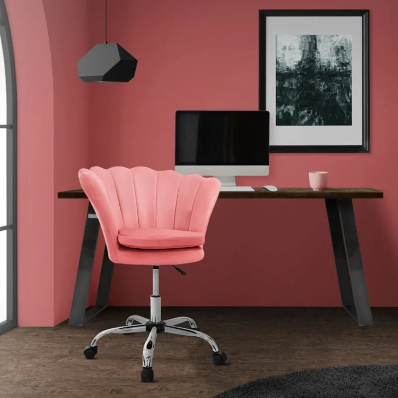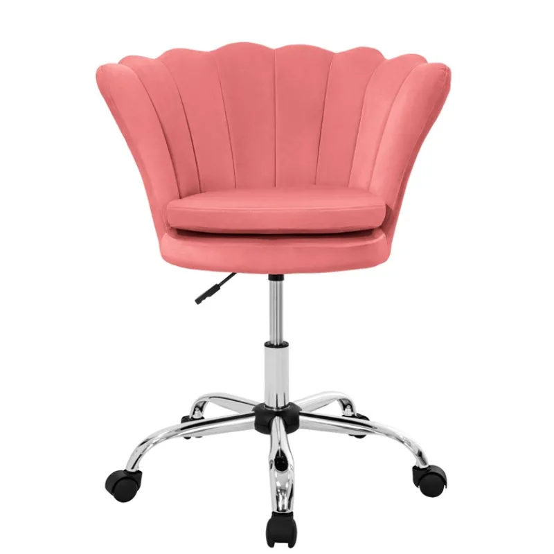 Die Muschel-förmige Rückenlehne ist nicht nur ein Blickfang, sondern bietet auch eine ergonomische Unterstützung, die deine Arbeitstage angenehmer macht. Der weiche Samtbezug verleiht dem Stuhl nicht nur eine luxuriöse Note, sondern sorgt auch für ein angenehmes Sitzgefühl.