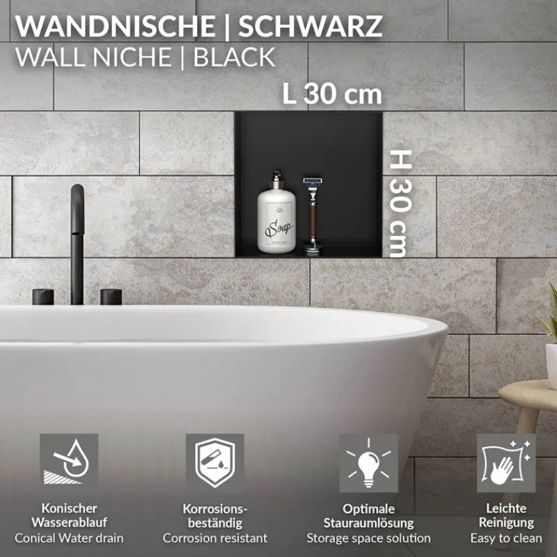 • Optimale Größe von 30 cm x 30 cm: Mit einer Länge von 300 mm bietet unsere Wandnische ausreichend Platz für Shampoo, Seife, Schwämme und andere Duschutensilien. Damit hast du alles, was du brauchst, bequem in Reichweite.