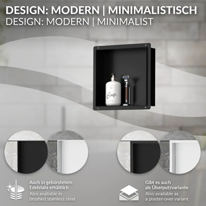 • Langlebiger Edelstahl: Unsere Wandnische ist aus robustem, rostfreiem Edelstahl gefertigt, der für eine lange Lebensdauer und minimale Wartung steht. Du kannst sicher sein, dass dieses Produkt auch bei täglicher Nutzung in Topform bleibt.
