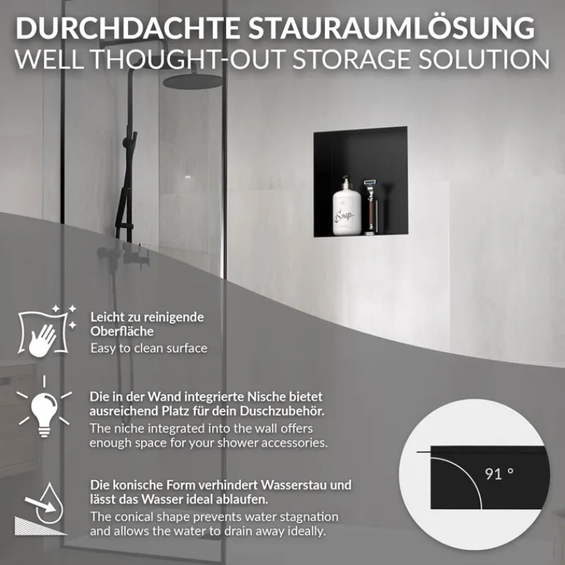 • Ordnung und Komfort: Unsere Wandnische hilft dir, Ordnung in deiner Dusche zu halten und deine Duschutensilien griffbereit zu haben. Damit wird deine Duschroutine zu einem komfortablen und angenehmen Erlebnis. Bestelle noch heute und erlebe die Vorteile von Qualität, Design und Funktionalität für dein Badezimmer.