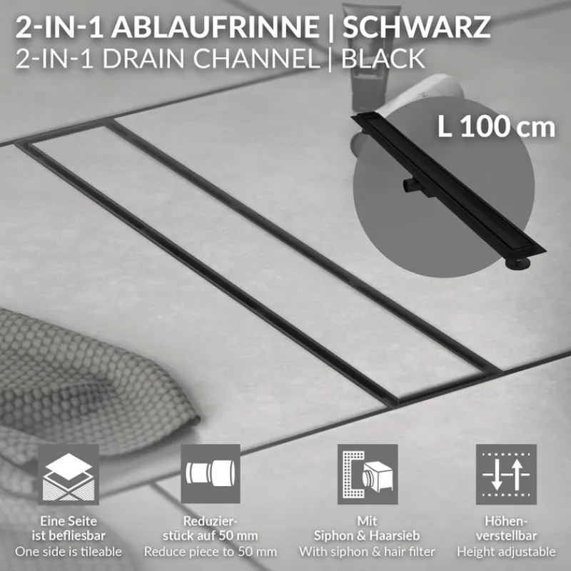 • Elegantes Schwarz: Unsere längste Edelstahl-Duschrinne ist in stilvollem Schwarz erhältlich und verleiht deinem Badezimmer einen Hauch von Eleganz.
