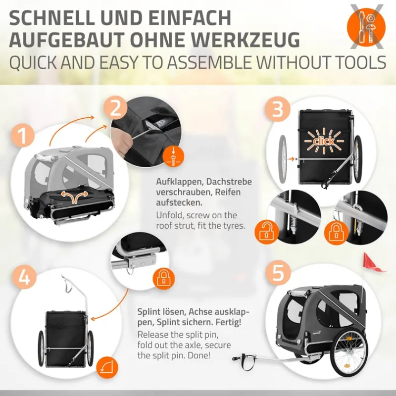 Dieser Fahrradanhänger bietet Deinem Hund ein gemütliches und sicheres Plätzchen für gemeinsame Fahrradausflüge. Die Montage und Demontage des Anhängers ist kinderleicht.