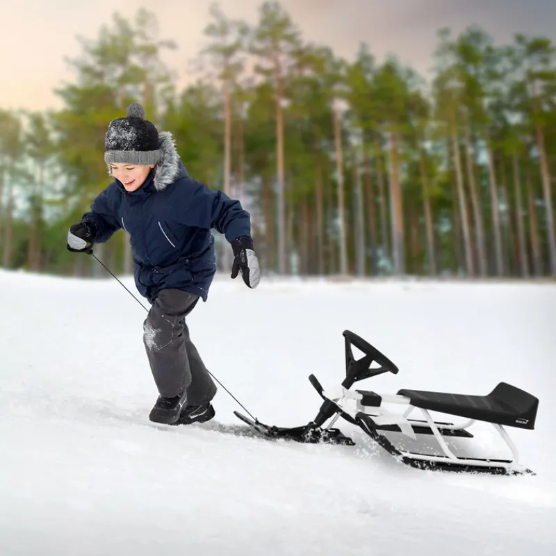 Der Lenkschlitten kombiniert hochwertige Materialien mit einem durchdachten Design, um Winterabenteuer auf ein neues Niveau zu heben. Der Rahmen besteht aus robustem Metall und ist speziell pulverbeschichtet, was ihm nicht nur Stabilität, sondern auch hohen Rostschutz verleiht – ideal für wiederholte Einsätze im Schnee. Der rutschfeste Sitz bietet hervorragenden Halt auch auf holprigem Gelände. Das Lenkrad mit einfacher Steuerung sorgt für optimale Kontrolle und erlaubt präzises Manövrieren. Dank der reaktionsschnellen Bremse haben Sie in jeder Situation volle Kontrolle, während die großen, kältebeständigen Kufen für eine sichere und flüssige Fahrt sorgen. Die Konstruktion ist zudem so ausgelegt, dass sie ein ausgewogenes Verhältnis zwischen Stabilität und Geschwindigkeit bietet – perfekt für Kinder.
