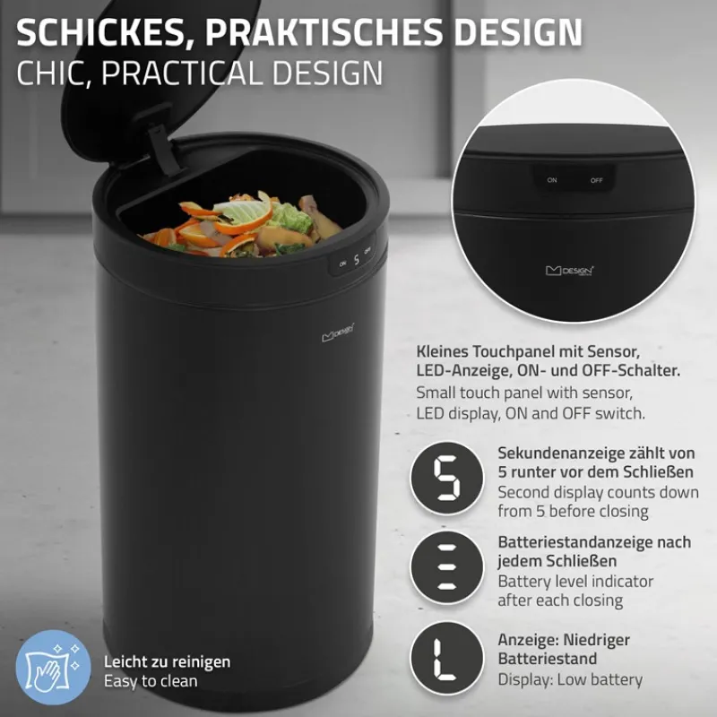Der robuste Korpus sorgt für Stabilität und Stil. Der Deckel besteht aus widerstandsfähigem ABS-Kunststoff. Über den ON/OFF-Schalter lässt sich die automatische Öffnungs- und Schließfunktion bei Bedarf deaktivieren. Zusätzlich verfügt der Mülleimer über einen „Offen halten“-Modus, bei dem der Deckel geöffnet bleibt, bis dieser Modus wieder beendet wird – ideal beim Kochen oder längeren Reinigungsarbeiten.