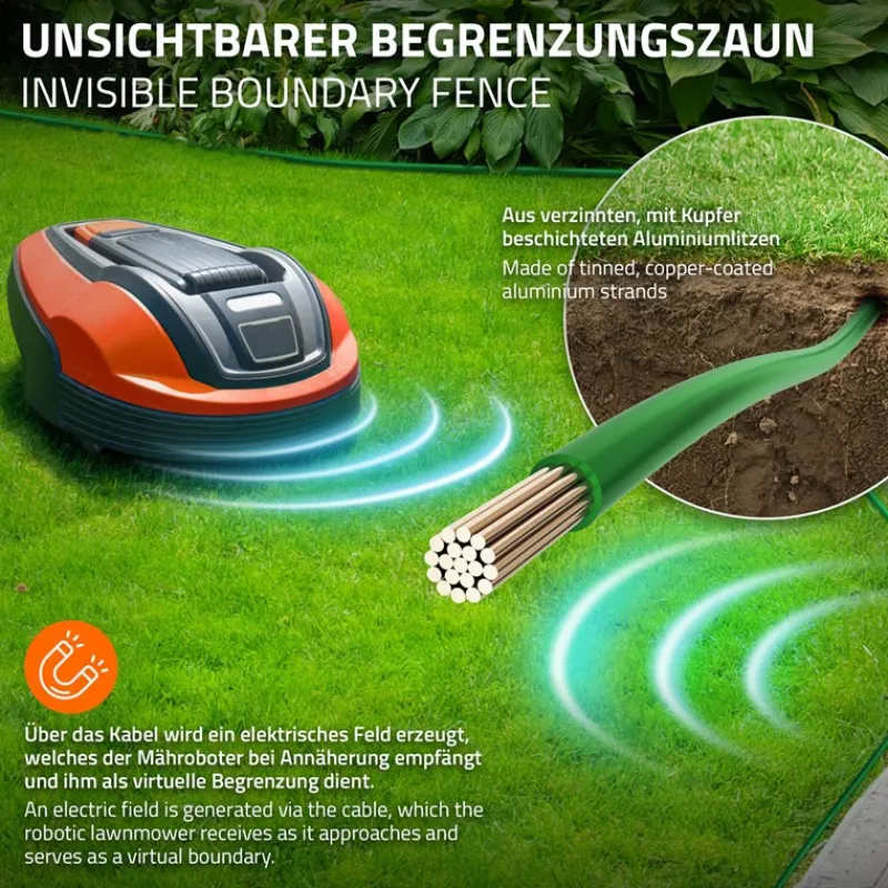 Mit unserem Mähroboter Begrenzungskabel lässt sich dein Garten einfach und effizient in verschiedene Bereiche aufteilen. So bestimmst du ganz genau, wo dein Mähroboter seine Arbeit verrichten soll und wo nicht.