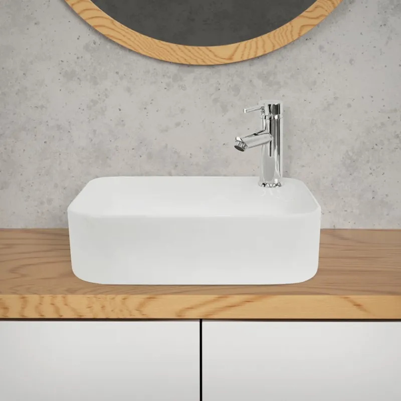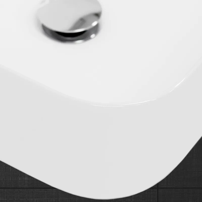 Das minimalistische Design mit den abgerundeten Ecken und dem schmalen Rand ist ein echter Blickfang. Es verbindet Modernität und Klarheit mit einem großzügigen und zugleich platzsparenden Waschbereich.