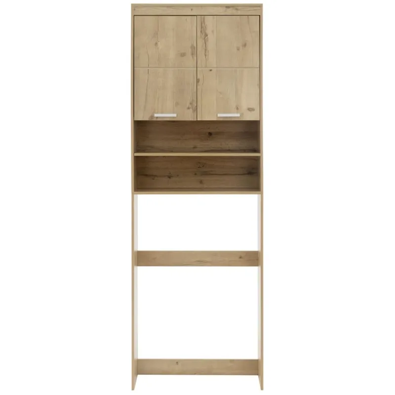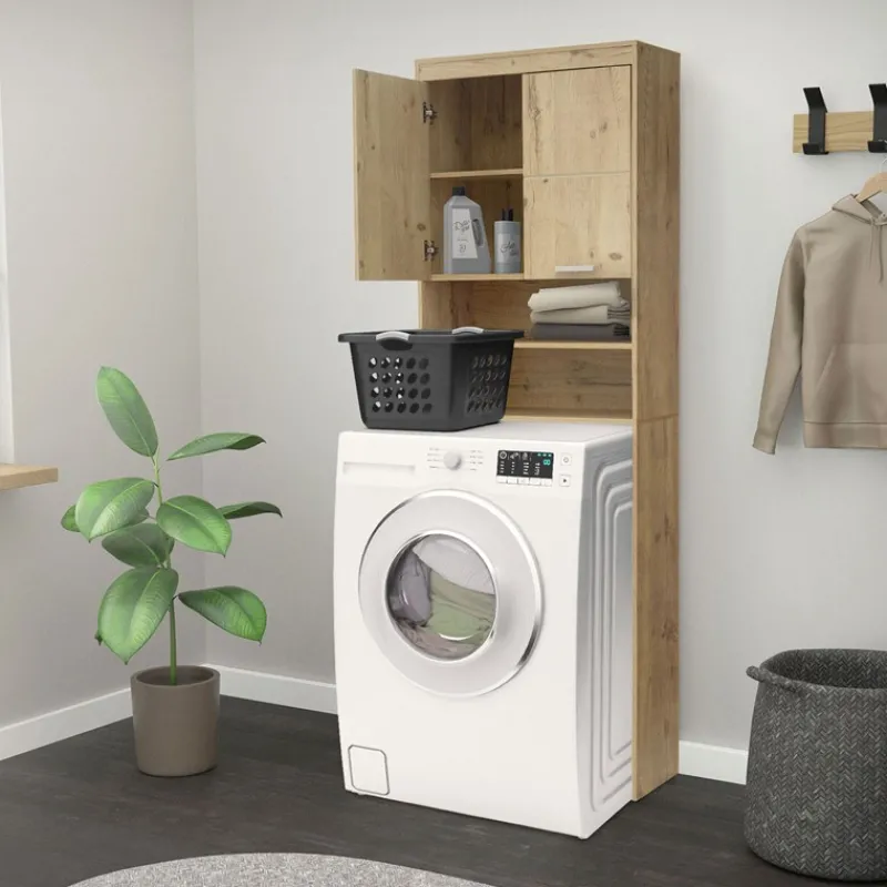 Der Waschmaschinenschrank ist aus strapazierfähiger, melaminbeschichteter Spanplatte hergestellt. Die Eichenoptik fügt sich perfekt in die verschiedensten Einrichtungsstile und passt sich ideal in jeden Wohnraum ein.