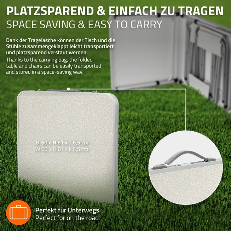 Dieser Koffertisch mit 4 Hockern ist hervorragend für Picknick und Camping geeignet. Er hat nicht nur ein zeitloses Design, sondern überzeugt auch in seiner Funktionalität. Der Campingtisch und die Hocker sind für den Transport und die Aufbewahrung zusammen klappbar. Dank dieser Funktion wird ein einfacher Transport und eine platzsparende Aufbewahrung ermöglicht. Genieße ein gemütliches Essen mit deinen Liebsten im Freien, ohne lästige Schlepperei von schweren Stühlen und Tischen.