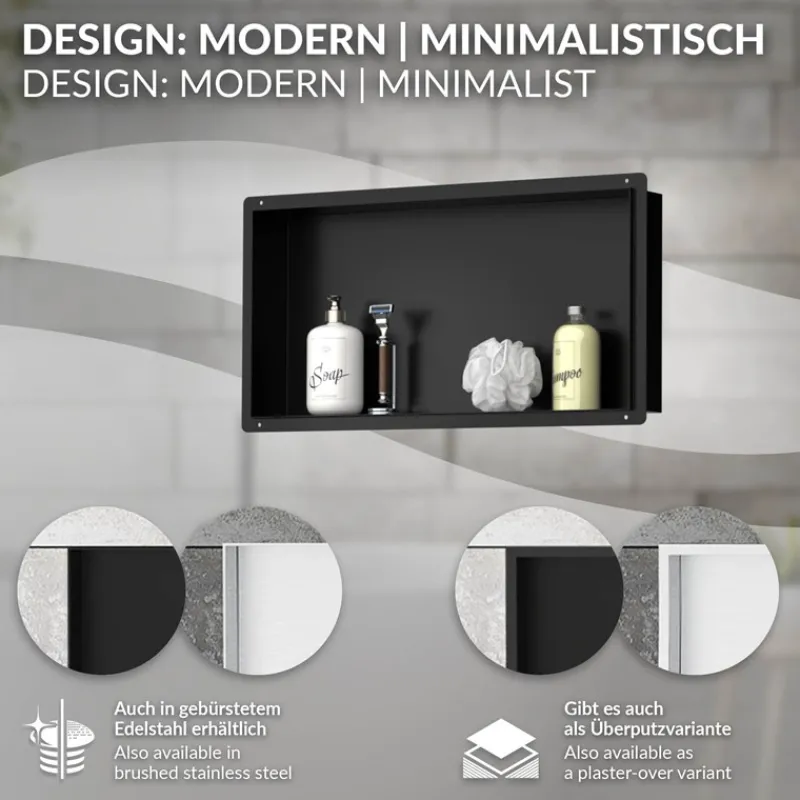• Langlebiger Edelstahl: Unsere Wandnische ist aus robustem, rostfreiem Edelstahl gefertigt, der für eine lange Lebensdauer und minimale Wartung steht. Du kannst sicher sein, dass dieses Produkt auch bei täglicher Nutzung in Topform bleibt.