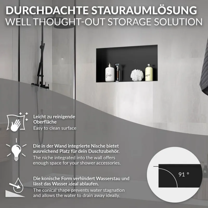 • Einfache Installation: Die Wandnische lässt sich leicht und problemlos in deinem Badezimmer installieren. Damit sparst du Zeit und Aufwand bei der Einrichtung.