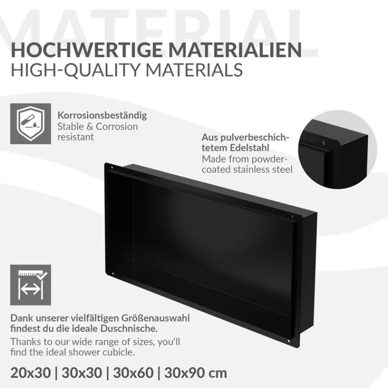 • Ordnung und Komfort: Unsere Wandnische hilft dir, Ordnung in deiner Dusche zu halten und deine Duschutensilien griffbereit zu haben. Damit wird deine Duschroutine zu einem komfortablen und angenehmen Erlebnis. Bestelle noch heute und erlebe die Vorteile von Qualität, Design und Funktionalität für dein Badezimmer.