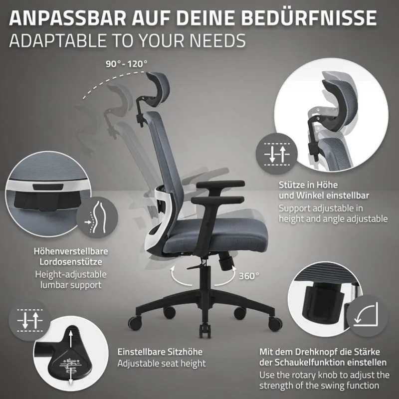 Erlebe ultimativen Komfort und Ergonomie mit unserem modernen Bürostuhl. Dieser Stuhl ist speziell entwickelt, um sich an deine Bedürfnisse anzupassen und bietet herausragende Unterstützung und Bequemlichkeit für lange Arbeitstage. Dank verstellbarer Funktionen und hochwertiger Materialien ist dieser Bürostuhl die perfekte Wahl für dein Home-Office oder den professionellen Arbeitsplatz.