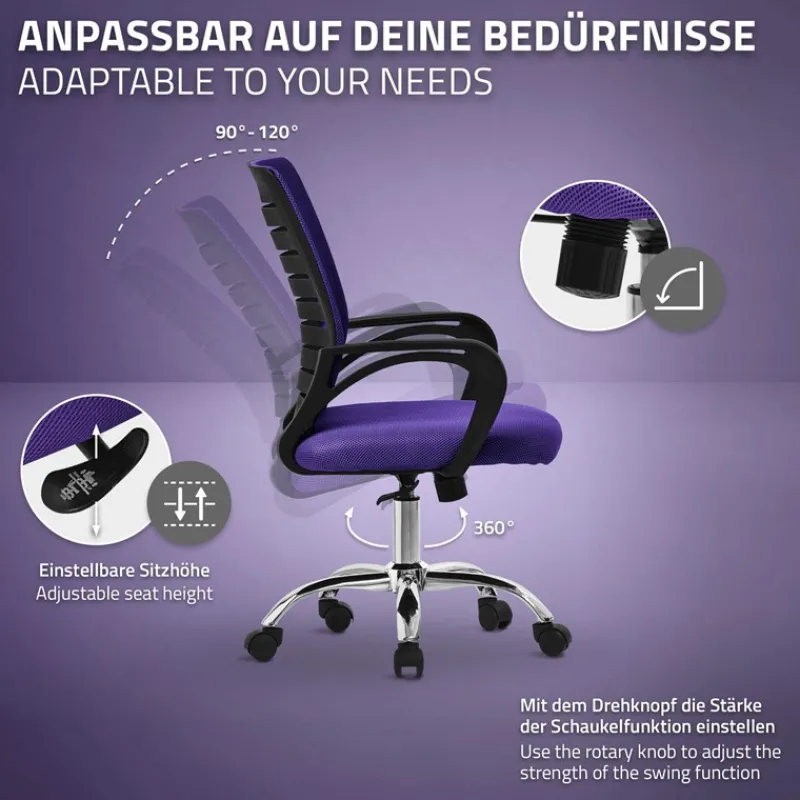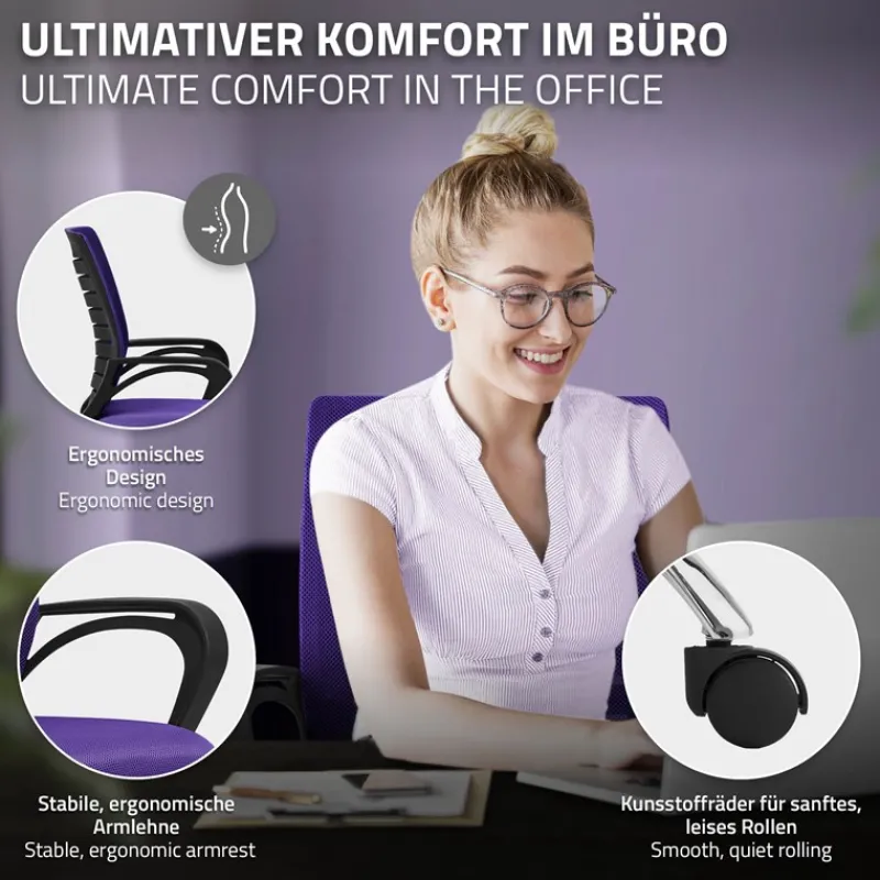 Seine atmungsaktive Netzrückenlehne bietet ergonomische Unterstützung, fördert eine korrekte Haltung und verhindert Unannehmlichkeiten bei langem Gebrauch. Die Sitzhöhe ist zwischen 43-52 cm verstellbar, was es Ihnen ermöglicht, die perfekte Sitzposition zur richtigen Ausrichtung mit Ihrem Schreibtisch zu finden.