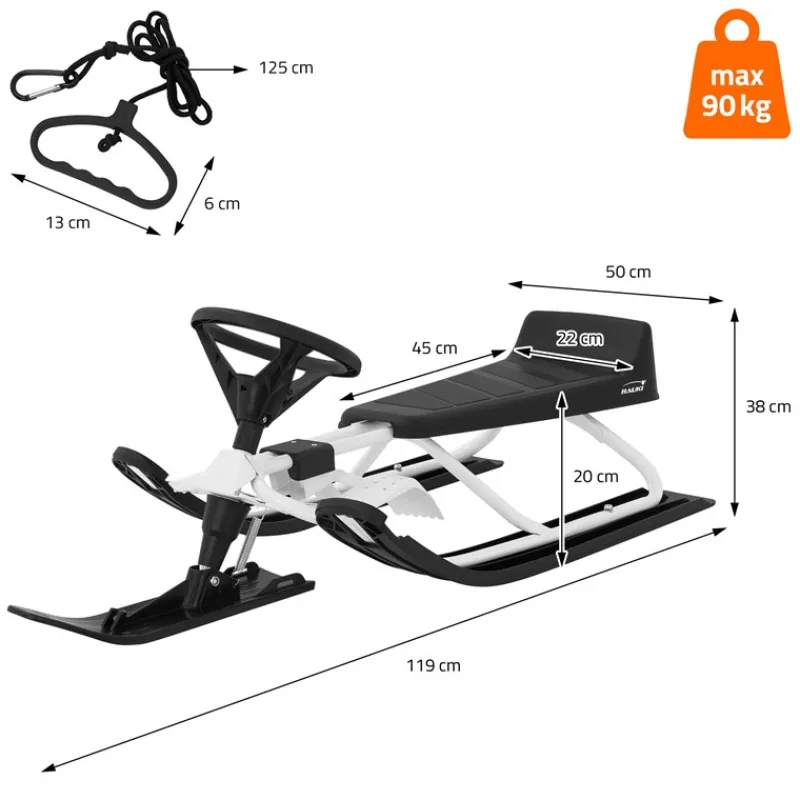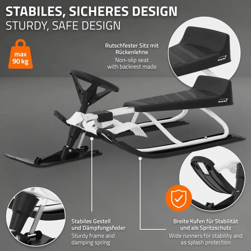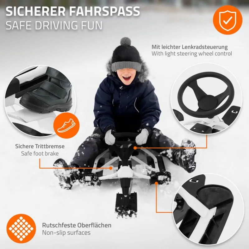 Der Lenkschlitten kombiniert hochwertige Materialien mit einem durchdachten Design, um Winterabenteuer auf ein neues Niveau zu heben. Der Rahmen besteht aus robustem Metall und ist speziell pulverbeschichtet, was ihm nicht nur Stabilität, sondern auch hohen Rostschutz verleiht – ideal für wiederholte Einsätze im Schnee. Der rutschfeste Sitz bietet hervorragenden Halt auch auf holprigem Gelände. Das Lenkrad mit einfacher Steuerung sorgt für optimale Kontrolle und erlaubt präzises Manövrieren. Dank der reaktionsschnellen Bremse haben Sie in jeder Situation volle Kontrolle, während die großen, kältebeständigen Kufen für eine sichere und flüssige Fahrt sorgen. Die Konstruktion ist zudem so ausgelegt, dass sie ein ausgewogenes Verhältnis zwischen Stabilität und Geschwindigkeit bietet – perfekt für Kinder.