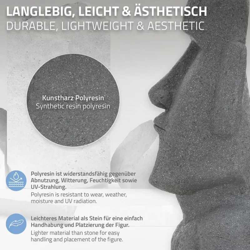 Die Moai Skulpturen der Osterinsel Rapa Nui stehen für Exotik, Mysterien und Abenteuer. Holen Sie sich mit diesen hochwertig und authentisch gearbeiteten, großen Figuren das ultimative Urlaubs-Feeling nach Hause oder in Ihren Garten – auch als Geschenk sind die geheimnisvollen Skulpturen eine tolle Überraschung!