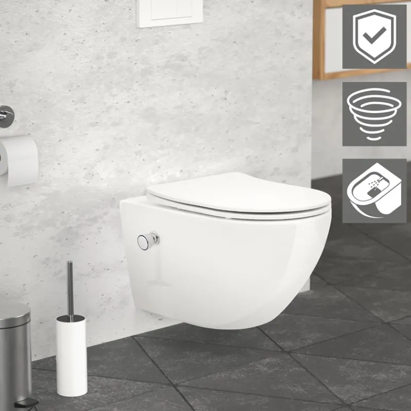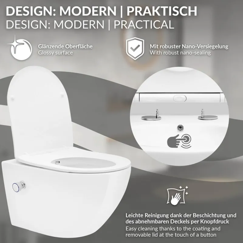 Dieses moderne Hänge-WC überzeugt mit innovativer Technologie, elegantem Design und maximaler Hygiene. Die kraftvolle Tornadospülung sorgt für eine gründliche und effiziente Reinigung, während der Softclose-Klodeckel geräuschloses Schließen garantiert. Zusätzlich verfügt die Toilette über eine praktische Bidet Funktion. Dank der Nanobeschichtung bleibt dein WC zudem lange sauber und glänzend.