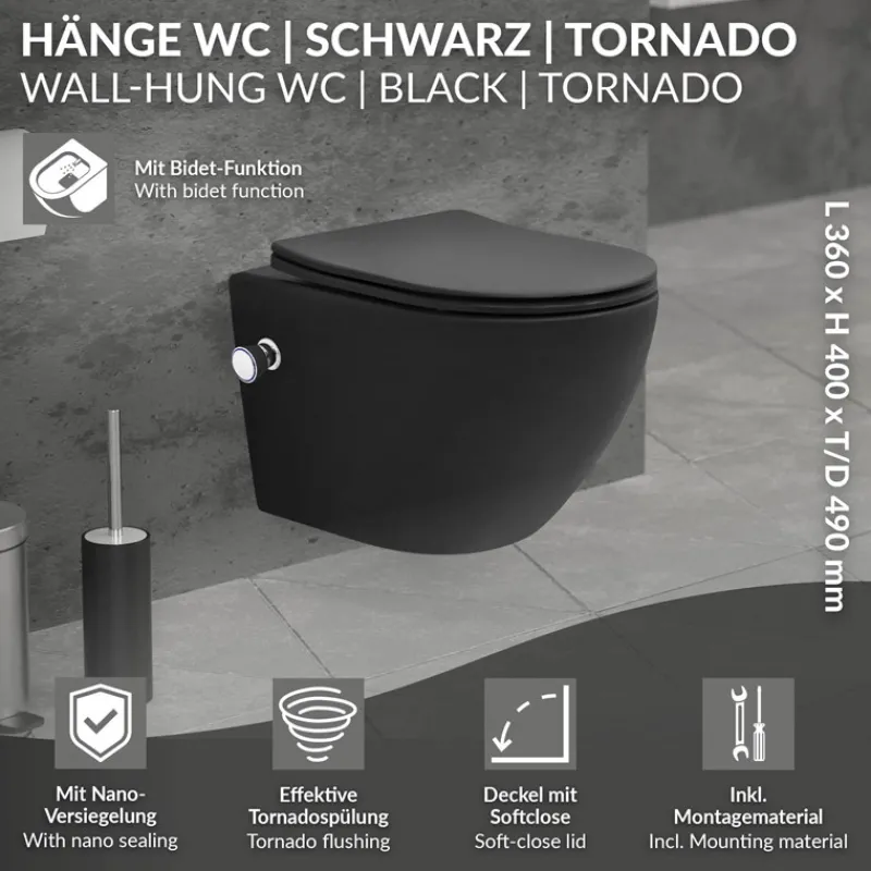 Dieses moderne Hänge-WC mit Nano-Versiegelung überzeugt mit innovativer Technologie, elegantem Design und maximaler Hygiene. Die kraftvolle Tornadospülung sorgt für eine gründliche und effiziente Reinigung, während der Softclose-Klodeckel geräuschloses Schließen garantiert. Dank der Nano-Versiegelung bleibt dein WC zudem lange sauber und glänzend. Zusätzlich verfügt die Toilette über eine praktische Bidet Funktion.