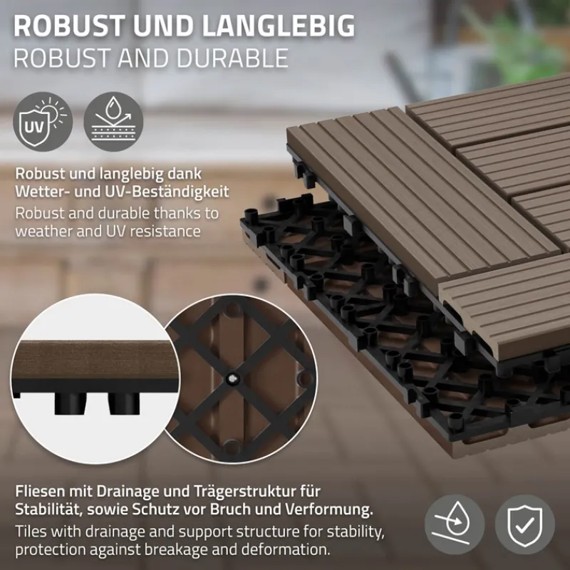 Diese Terrassenfliesen in dunkelbrauner Mosaikoptik mit intelligentem Stecksystem sind eine stilvolle und praktische Lösung für den Balkon, die Terrasse , den Garten, das Badezimmer und für den Sauna- und Poolbereich. Die Terrassenfliesen bestehen aus hochwertigem WPC-Material und sind daher sehr wetterbeständig. Außerdem sind sie rutschfest, splitterfrei und reißen nicht. Die Terrassenfliesen sind pflegeleicht und verleihen deiner Terrasse ein sauberes und gepflegtes Aussehen.